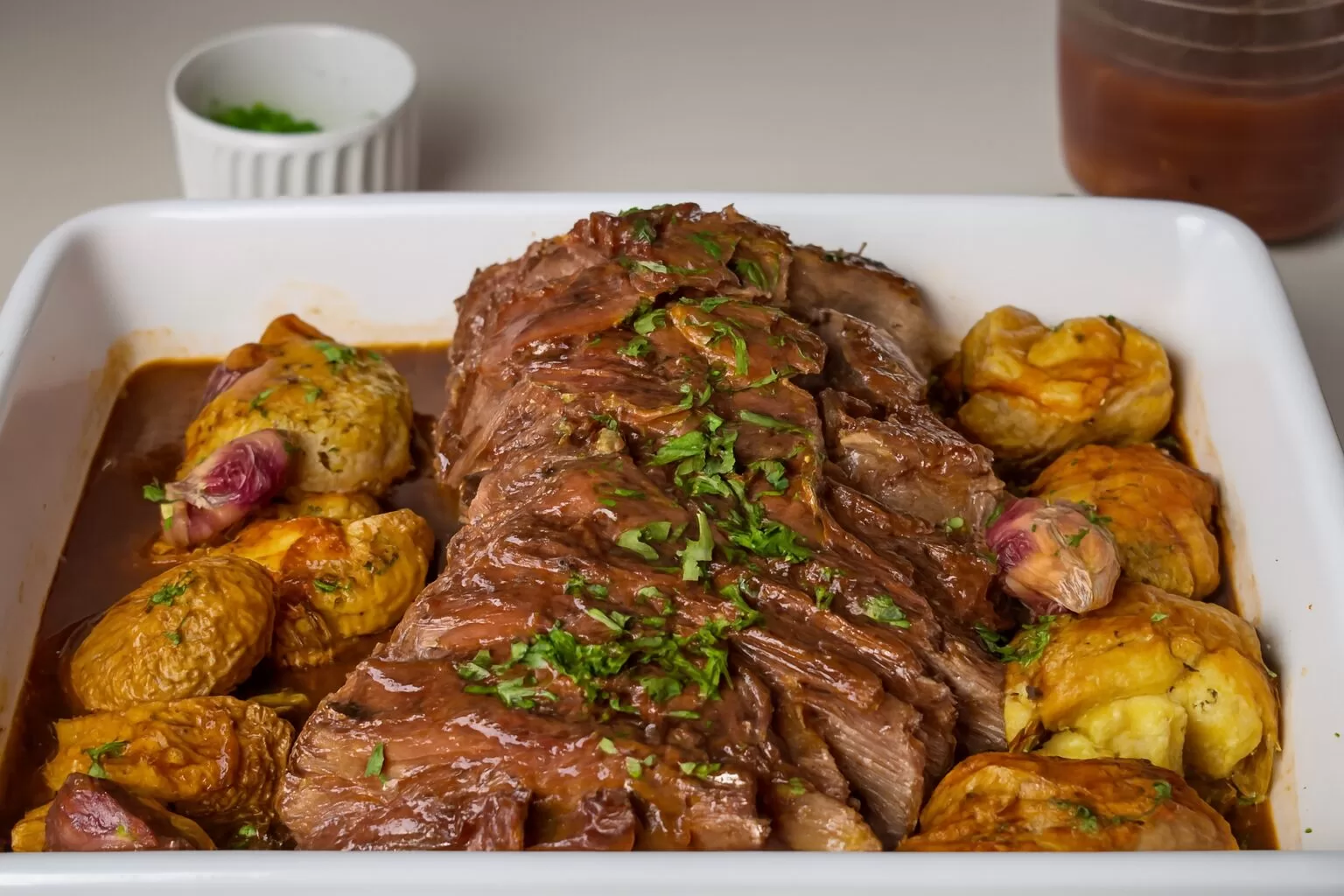 Quando a carne estiver pronta, fatie e sirva com o molho por cima, acompanhada das batatinhas gratinadas e um toque de salsinha picada.
